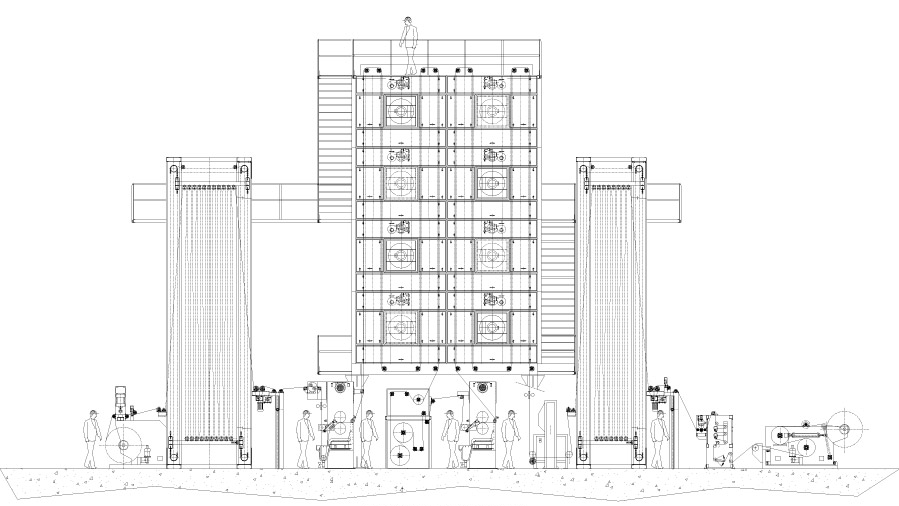 -Arm-radial re-winder (duplex)--Finishing Cutter--Conveyor--Hydraulic Stacker--Surrounding Protection Chamber Exhausting Waste Gas RTO incinerator.